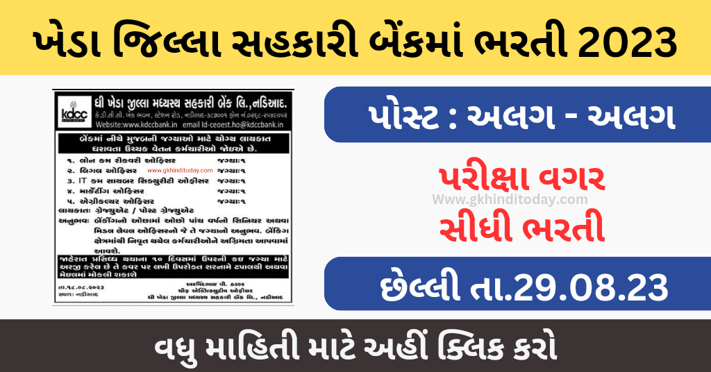 KDCCBANK Recruitment 2023 For Various Posts. The Kheda Jilla Madhyastha Sahakari Bank Ltd Nadiad has Published Legal Officer, Marketing and Other Vacancy. Bank Job in Nadiad. Job Seekers Can Apply For this kdccbank.in  Recruitment 2023.